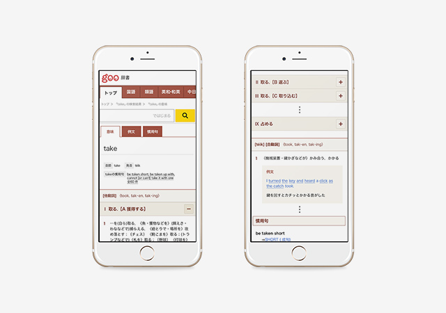 goo辞書、goo WikipediaのSPデザインを担当しました。スマートフォンという比較的小さな画面から情報を得る際の視認性・可読性を高めるために、何がどこにどのように表示されているべきかを改めて整理し、デザインのアップグレードをおこないました。