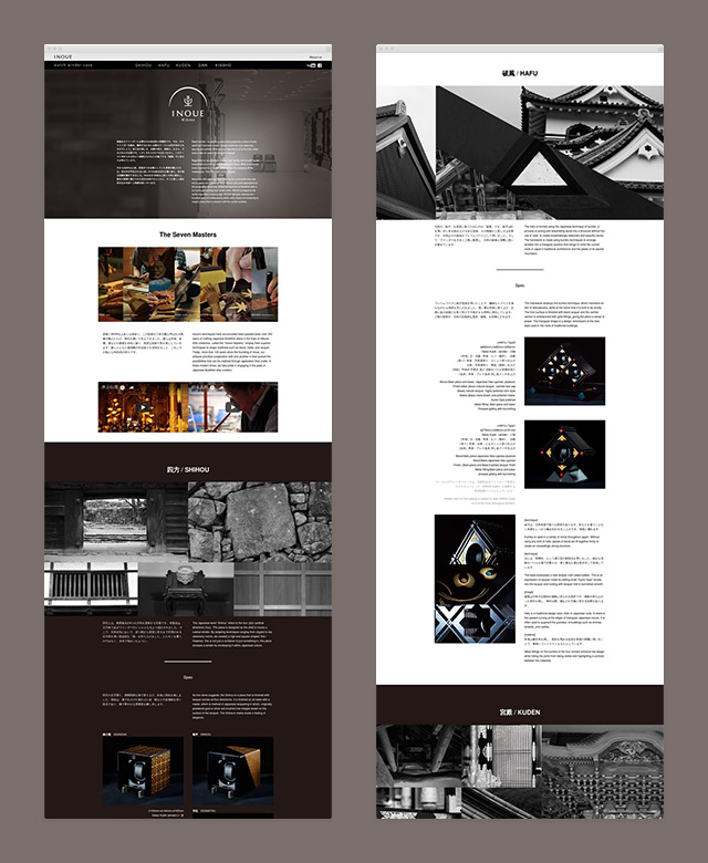 The Inoue Butsudan (Buddhist altars) has been running the business since 1901 in creating the Hikone Butsudan, which is known as high-class Buddhist altars, using plenty of lacquer works and gold leaves. Each of the craftsmen with specialized skills through all seven engineering departments has crafted watch winders, for which we have designed the pamphlet and movies for the watch winders.