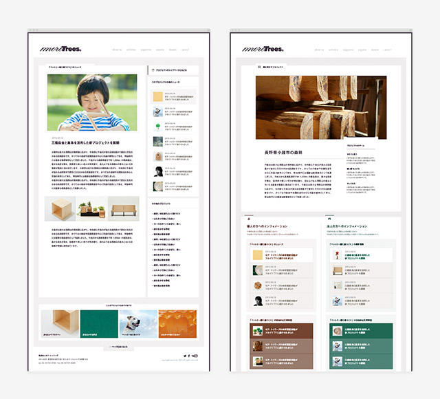 単なるホームページではなく営業的な意味合いも強化したウェブサイトにすべく、カウンセリングを経てコミュニケーションコンサルティングを実施しました。内部での更新を容易にするためにwordpressへの全面移行を行い、最終的にはmore treesの活動が活発に行われていることを発信する骨太さと、洗練された団体であるというイメージを両立できるウェブサイトが出来上がりました。