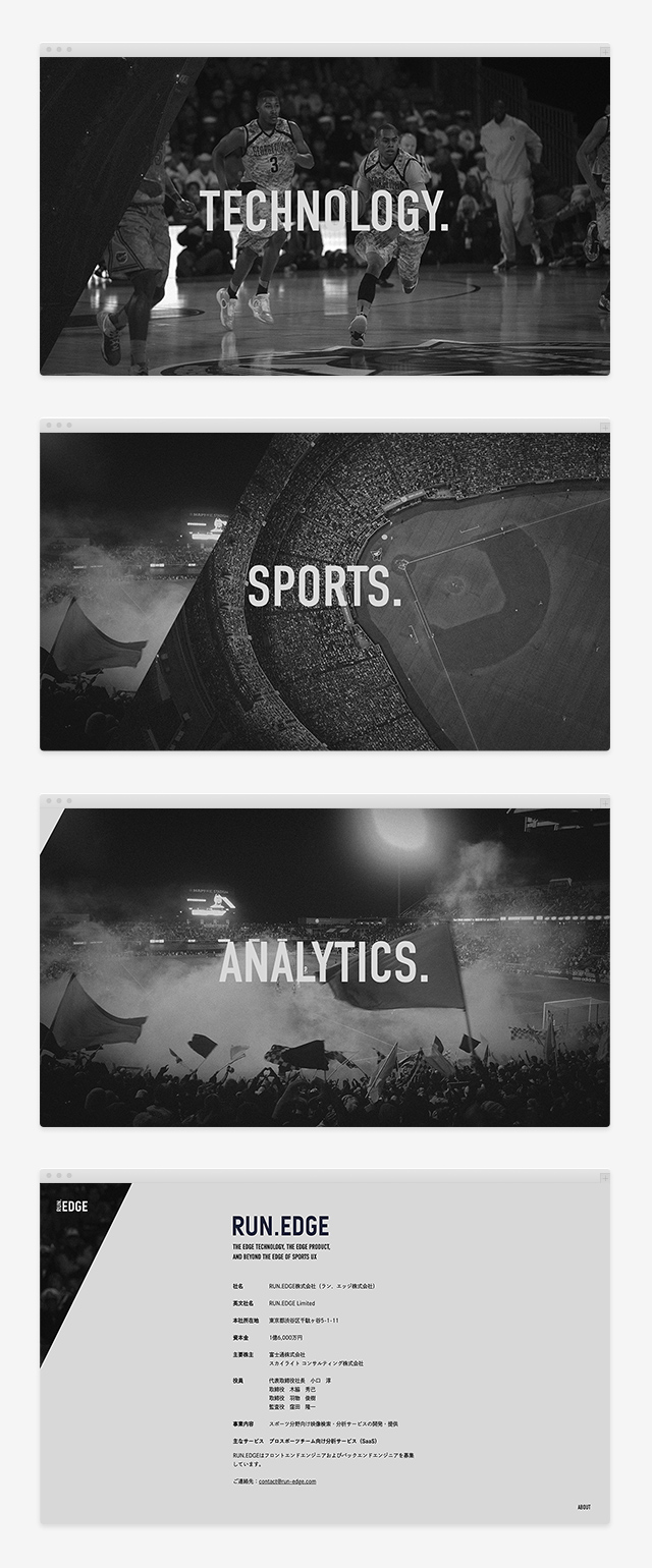 スポーツ分野向けの映像検索や分析サービスの開発をおこなうRUN.EDGE株式会社のWebデザインを担当しました。