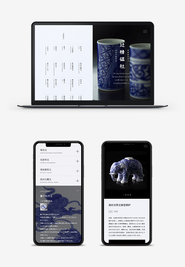 辻精磁社は、これまで一般の方向けに情報を発信するツールをほとんど有していなかったため、まず辻精磁社が生みだしてきた作品や商品を整理し、それぞれの絵付けに込められた意味を可視化しました。Webのデザインは、辻精磁社の美しく繊細な絵付けを表現するため、写真をメインにした構造になっています。